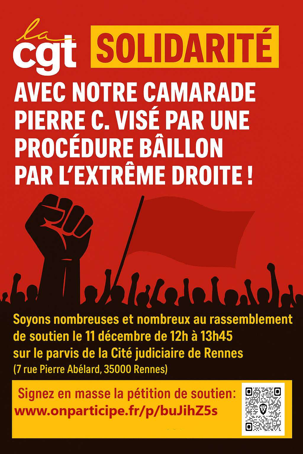 • 🔎Participation au financement de la défense par des dons . Les chèques sont à adresser à la CGT Éduc’action 35 (31 boulevard du Portugal, 35200 Rennes) en précisant « soutien financier à la défense de Pierre C. ». En cas de relaxe, l’argent sera reversé pour servir la lutte contre les cas de répression syndicale.